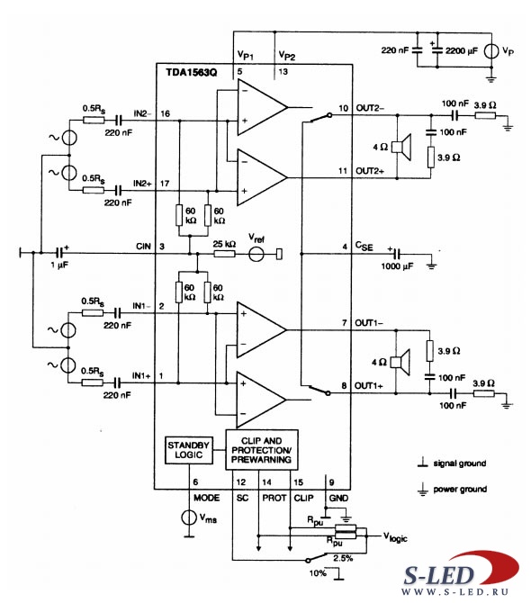 Двухканальный мостовой УМЗЧ с одно-полярным питанием для применения в автомобильной аудиотехнике. Есть два режима работы по максимальному КНИ (10% и 2,5%), соответственно, разная мощность.