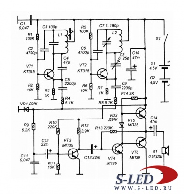 Этот металлоискатель собран по классической схеме с двумя генераторами и использованием биений. Он позволяет обнаруживать металлические предметы на глубине до одного метра. Опорный генератор собран на транзисторе Т1 и частота генерируемых им колебаний определяется колебательным контуром L1, С2. Поисковый генератор собран на транзисторе Т2 и частота генерируемых им колебаний определяется контуром, образованным индуктивностью поисковой катушки L2 и конденсатором С9.