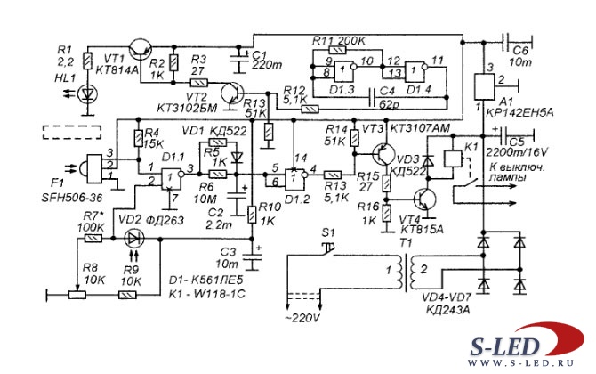 Устройство автоматического включения и выключения построена на основе двух оптических датчиков и позволяет включать и выключать настольную лампу в зависимости от присутствия человека за столом. Один из датчиков обыкновенный фотодиод, его расположение выбрано так, чтобы на него не попадал свет лампы, но попадал свет из окна. Тем самым происходит блокировка автоматического включения в дневное время (ясную погоду). Как только меняется погода или темнеет фотодиод разрешает включение лампы.