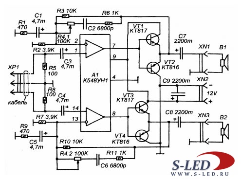 Многие компьютерные CD-ROM приводы, имеют на передней панели гнездо для наушников и регулятор громкости. Многие пользователи, во время работы на компьютере слушают музыку используя данное устройство. Но длительное прослушивание музыки в наушниках вредно сказывается на здоровье. Поэтому лучше для этих целей использовать компактные акустические системы (колонки). В продаже имеется большее количество данных устройств, но даже в силу их дешевизны приобрести их может позволить себе не каждый. В данной схеме представлен усилитель звуковой частоты для CD-ROM на микросхеме К548УН1 содержащей двух-канальный УЗЧ и четырех транзисторах (двух КТ816 и двух КТ817), работающих в выходном каскаде.